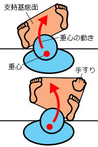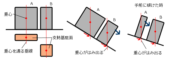 物体A、Bはそれぞれバランスを保ちやすい向き、バランスを失いやすい向きを持ってます。それは即ち、支持基底面の形の違いに起因しています。重心を通る垂線が支持基底面を通過する位置から支持基底面の最外郭までの水平距離が近い方向にバランスは崩れやすく、遠い方向にはバランスは安定することが解ります。バランスをより安定させるには、重心の動く方向に支持基底面の形を広げて距離を長くすることです。