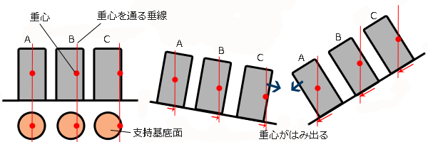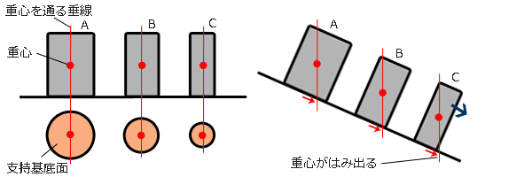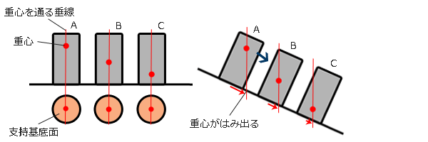 3つの物体を同じ角度だけ右に傾けていくと、重心を通る垂線が支持基底面を通過する位置が少しずつ右側に移動していきます。やがて支持基底面からはみ出す物体が出ます。最も早くはみ出すのが物体Aです。はみ出した瞬間に物体Aはバランスを失い倒れます。更に傾けていくと、次に倒れるのが物体B、最後が物体Cとなります。